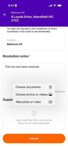 - Tap Resolve once the work has been completed. (You’ll need to provide evidence in the form of documents, images or videos.)