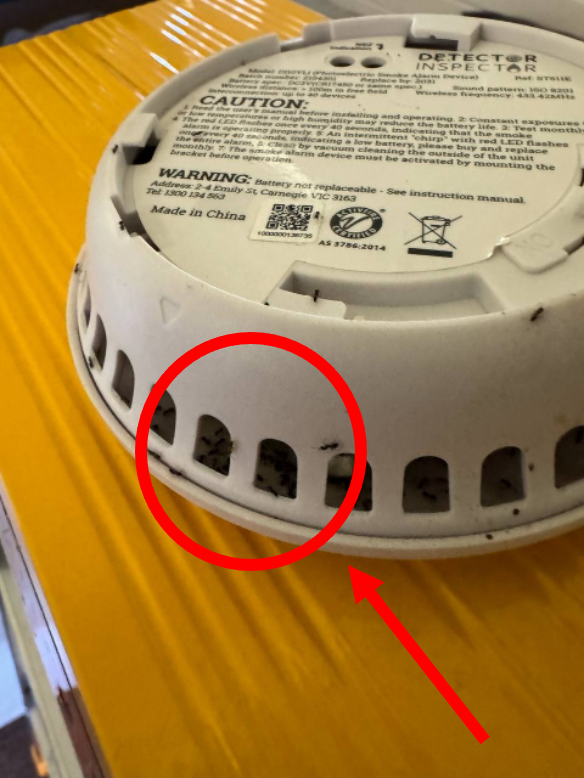 This alarm has been compromised by an ant infestation, visible through the numerous ants within its sensors and openings on the casing. Such damage caused by pests infiltrating the device is not categorised as a manufacturing defect, and therefore, is not covered under warranty.