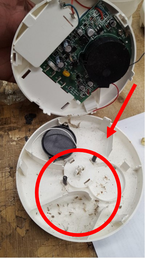 This alarm has clearly not been maintained as the interior of the alarm is full of dead insects. Such damage caused by lack of maintenance is not categorised as a manufacturing defect, and therefore, is not covered under warranty.